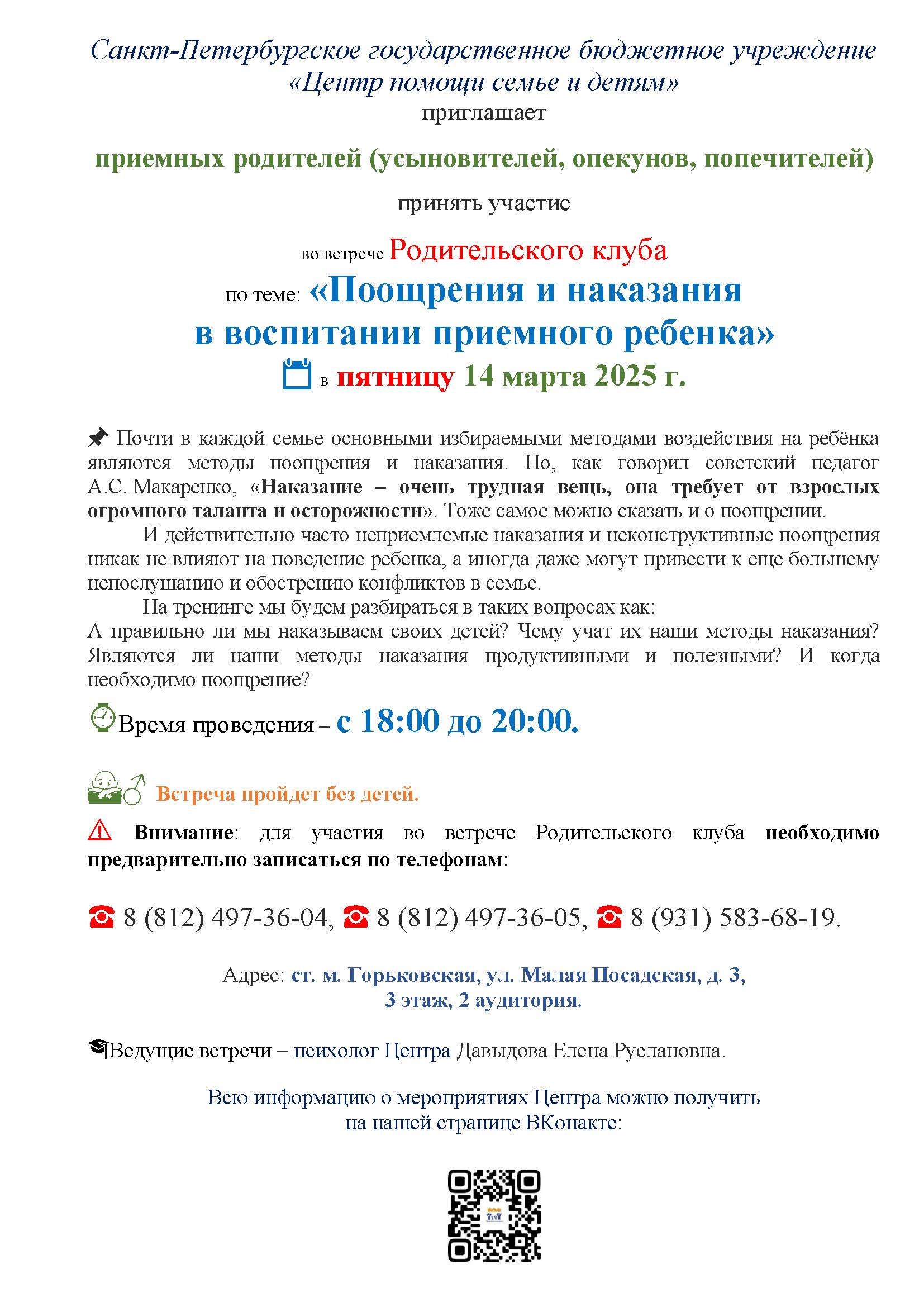 Встреча Родительского клуба по теме: «Поощрения и наказания в воспитании приемного ребенка»